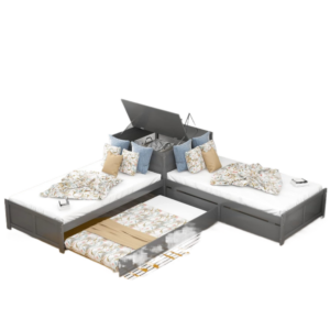 L-Shaped Twin Platform Bed Gray with Trundle and Storage